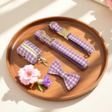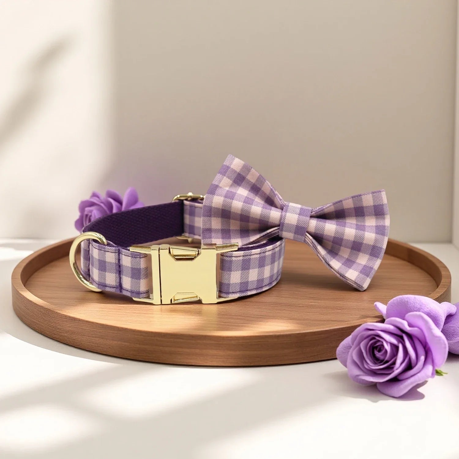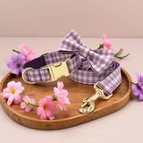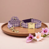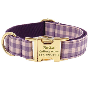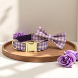 Custom Dog Collar with Name Engraved Gold Metal Buckle Purple Gingham