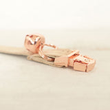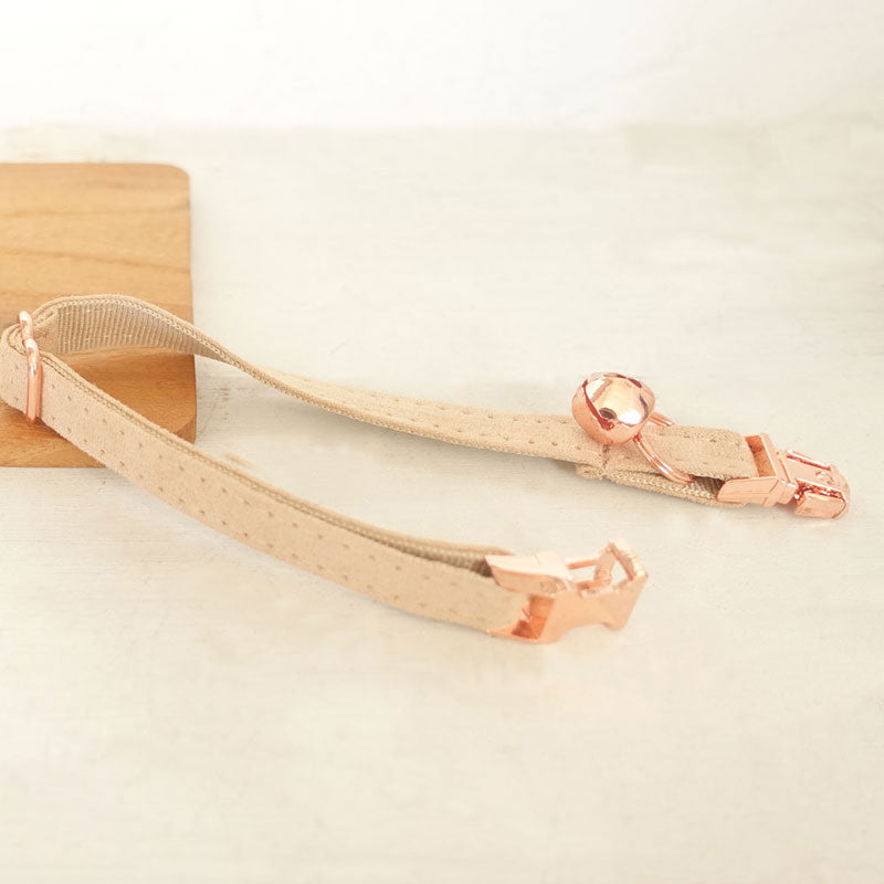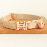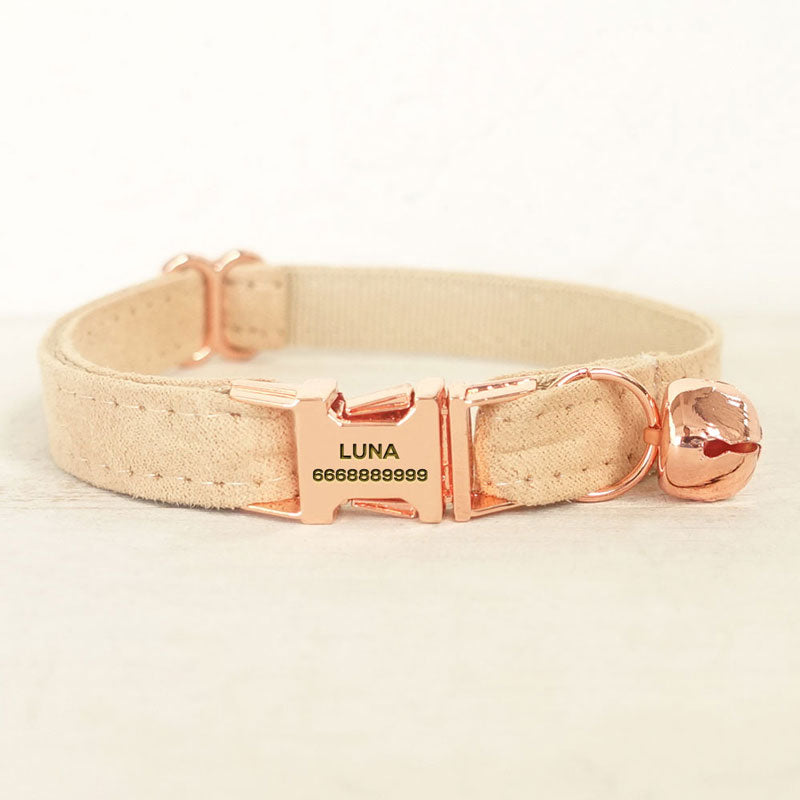Collar de gato personalizado con cascabeles grabados, hebilla de metal dorado rosa y terciopelo nude