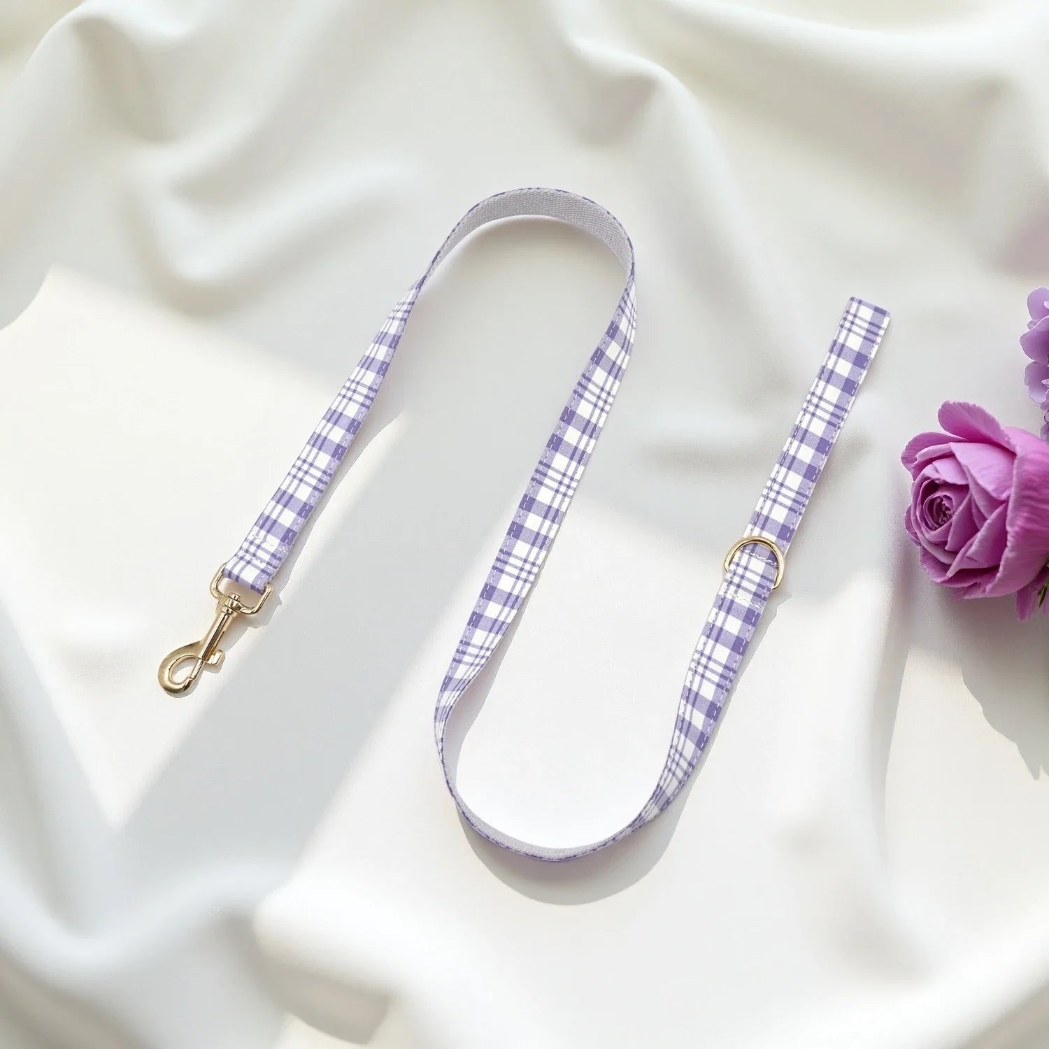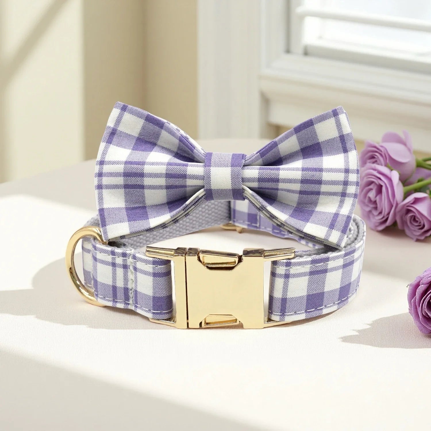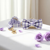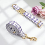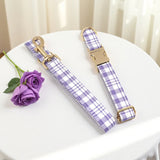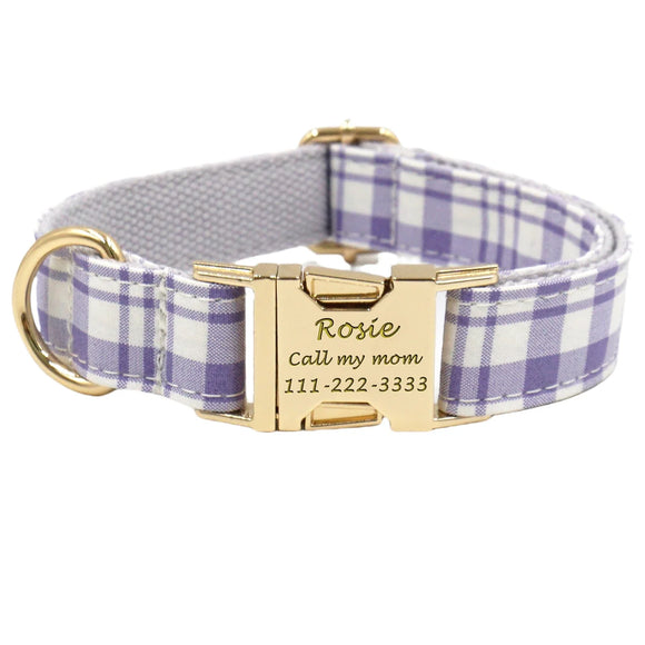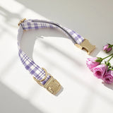 Custom Dog Collar with Name Engraved Gold Metal Buckle Lavender Plaid