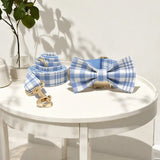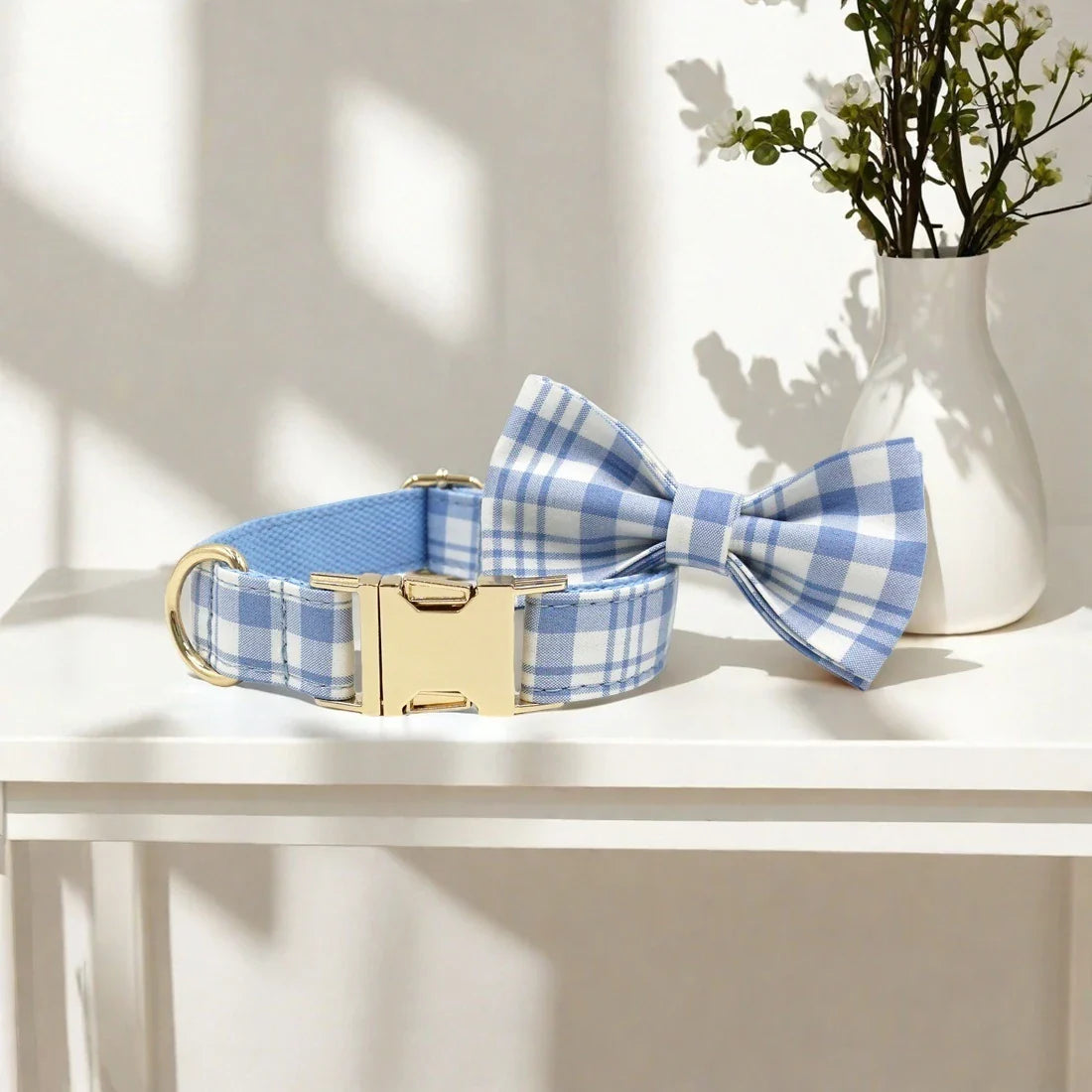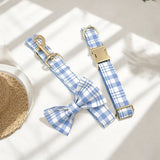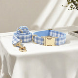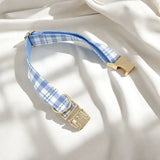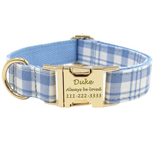 Custom Dog Collar with Name Engraved Gold Metal Buckle Sky Blue Plaid